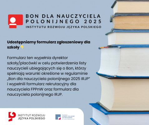 W związku z trwającą rekrutacją do programu „Bon dla nauczyciela polonijnego 2025 IRJP”, Fundacja udostępnia formularz zgłoszeniowy dla szkoły.